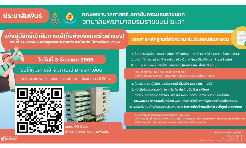 แจ้งผู้มีสิทธิ์เข้าสัมภาษณ์(ทั้งตัวจริงและตัวสำรอง) รอบที่ 1 Portfolio หลักสูตรพยาบาลศาสตรบัณฑิต ปีการศึกษา 2569
