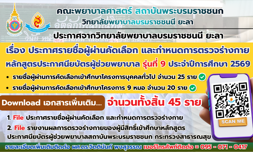 ประกาศวิทยาลัยพยาบาลบรมราชชนนี ยะลาเรื่อง ประกาศรายชื่อผู้ผ่านคัดเลือก และกำหนดการตรวจร่างกาย หลักสูตรประกาศนียบัตรผู้ช่วยพยาบาล รุ่นที่ 9 ประจำปีการศึกษา 2569 อ่านรายละเอียดเพิ่ม… วันที่ 16 มีนาคม พ.ศ. 2569 ผู้ดูแลระบบ 0 ดาวน์โหลดเอกสารเพิ่มเติม
