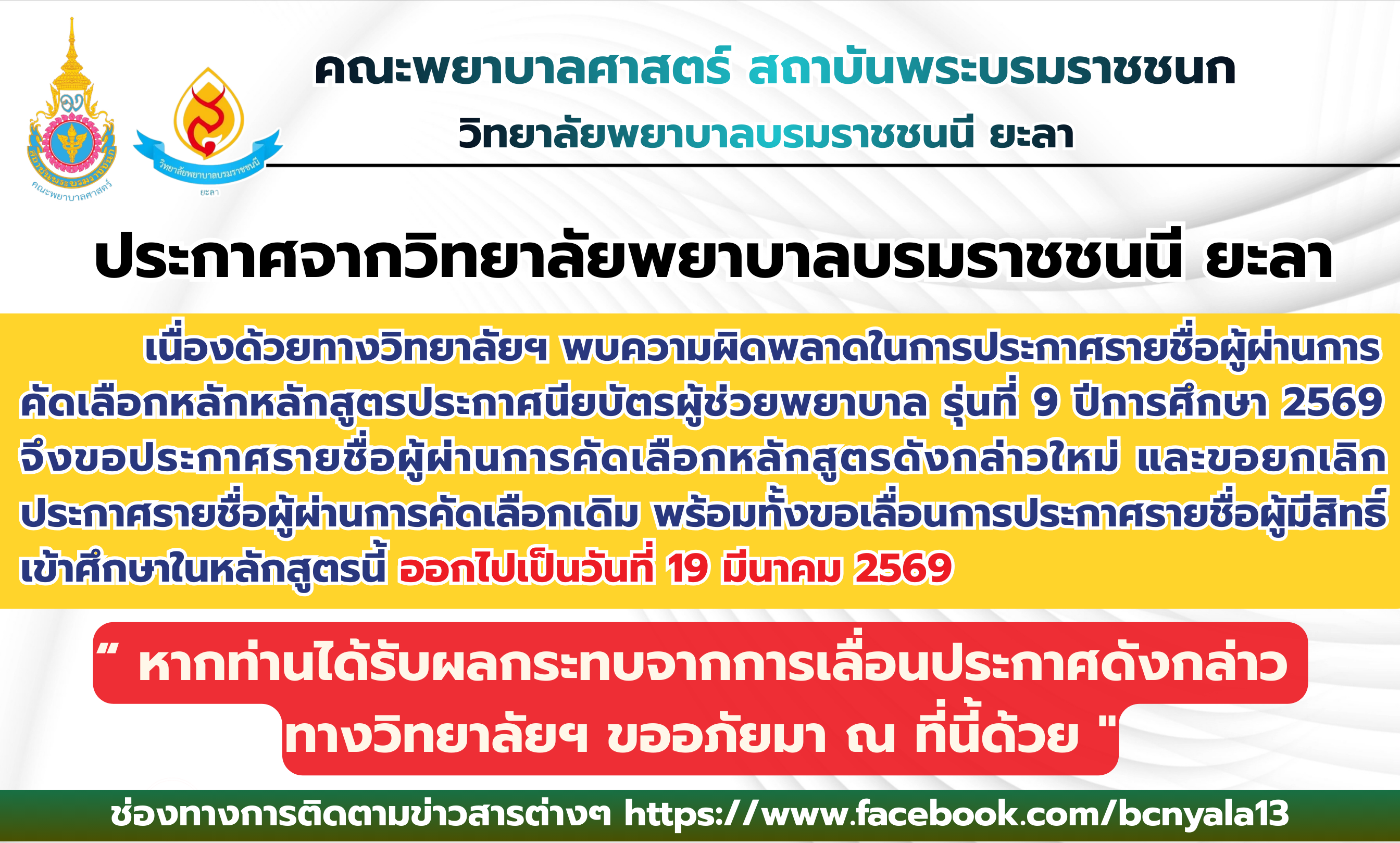 ประกาศจากวิทยาลัยพยาบาลบรมราชชนนี ยะลา เนื่องด้วยทางวิทยาลัยฯ พบความผิดพลาดในการประกาศรายชื่อผู้ผ่านการ คัดเลือกหลักหลักสูตรประกาศนียบัตรผู้ช่วยพยาบาล รุ่นที่ 9 ปีการศึกษา 2569 จึงขอประกาศรายชื่อผู้ผ่านการคัดเลือกหลักสูตรดังกล่าวใหม่ และขอยกเลิก ประกาศรายชื่อผู้ผ่านการคัดเลือกเดิม พร้อมทั้งขอเลื่อนการประกาศรายชื่อผู้มีสิทธิ์ เข้าศึกษาในหลักสูตรนี้ ออกไปเป็นวันที่ 19 มีนาคม 2569